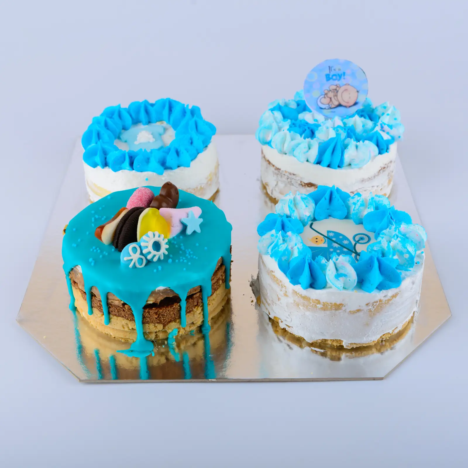 Napravićemo četiri male tortice u najfinijim ukusima, ukrašene muškom simboličnom, plavom bojom.