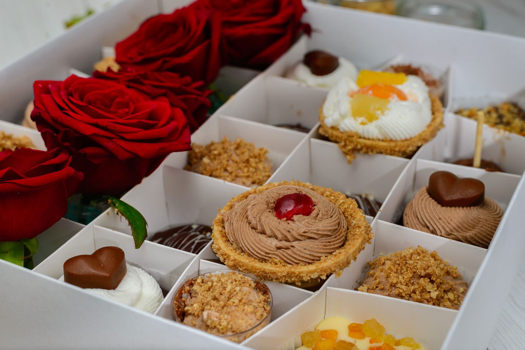 Posna Bombonjera sa Ružama sadrži: 20 kolača, 10 različitih vrsta i 5 crvenih ruža.